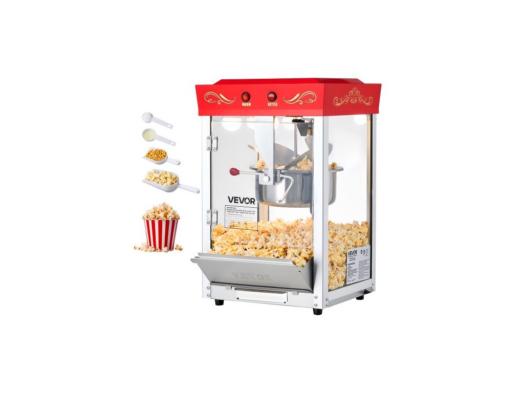 VEVOR Popcorn stroj, konvice z nerezové oceli s kapacitou 0,2 kg, 800W profesionální stolní popcorn stroj, 48 šálků na dávku, popcorn v divadelním stylu, s ovládáním 2 tlačítky, skleněná stěna, PC dvířka, 1 odměrka, 3 lžičky, červenýKonvice o objemu 237 ml