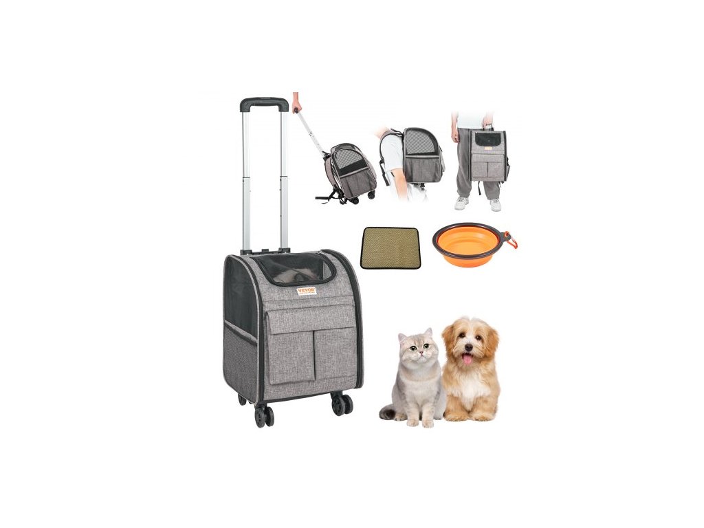 VEVOR Přepravka pro kočky s kolečky, kolečková přepravka pro domácí mazlíčky s teleskopickou rukojetí a ramenním popruhem, přepravka pro psy s kolečky pro domácí mazlíčky do 18 kg, s 1 skládací miskou, šedá