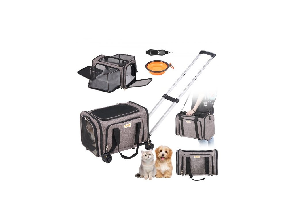 VEVOR Přepravka pro kočky s kolečky, schválená leteckou společností pro přepravku domácích mazlíčků s teleskopickou rukojetí a ramenním popruhem, přepravka pro psy s kolečky pro domácí mazlíčky do 11 kg, s 1 skládací miskou, šedá