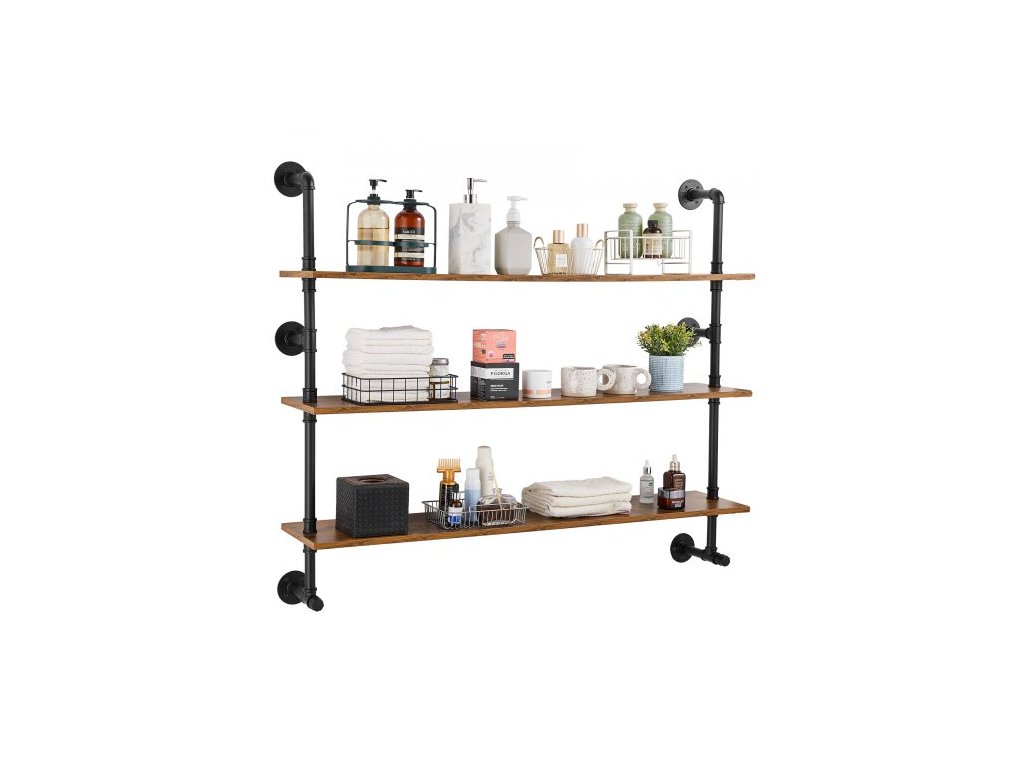 VEVOR Průmyslová trubková police, 3 úrovně, 48x9,84 palce, nástěnná plovoucí rustikální dřevěné police, držák na knihy, úložný stojan, držák na drobnosti do kuchyně, ložnice, koupelny, obývacího pokoje, černáOdolné proti korozi a odolné