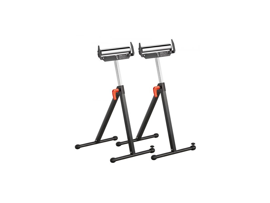 VEVOR Sada 2 válečkových stojanů, nosnost 113 kg/250 lbs, nastavitelná výška 686 mm–1092 mm/27–43 palců, skládací, odolný proti opotřebení, s leštěnou ocelovou válečkovou hlavou a vodítky hran, pro prodloužení podpěry stolní pily, obrábění dřevaRobustní konstrukce