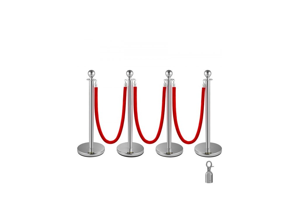 VEVOR Sada 4 zatahovacích stříbrných kulatých sloupků, sloupků pro regulaci davu, bariérových sloupků, tyčí s 1,5m červeným sametovým lanemSloupek z nerezové oceli