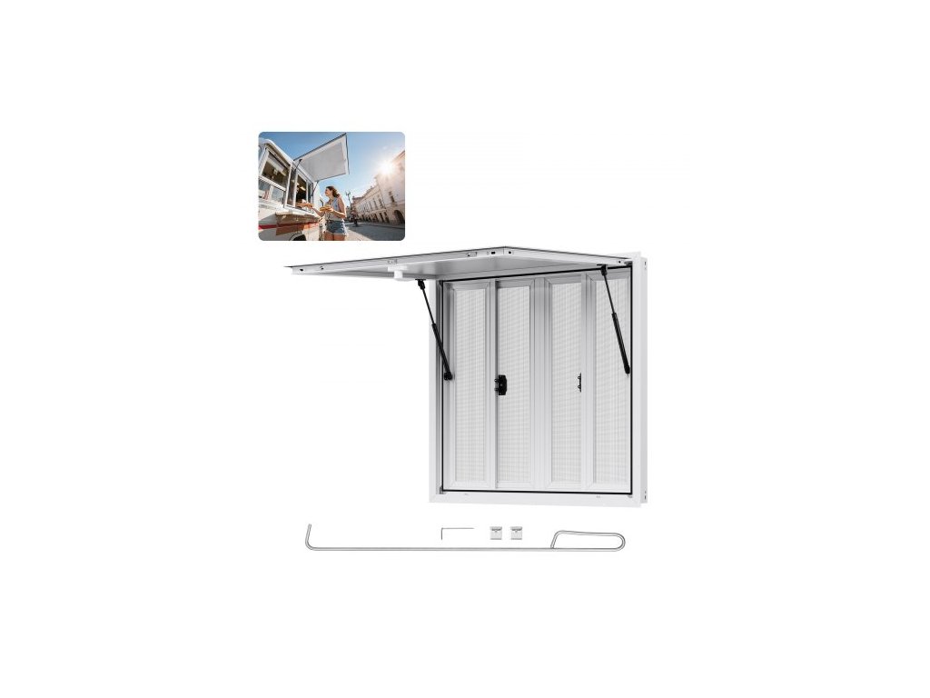 VEVOR Servírovací okno 92x92 cm, hliníkové slitinové servisní okno pro food truck, servírovací okno s úhlem otevření až 85 stupňů se 4 posuvnými okny, markýzou a tažným hákem, pro koncesní přívěsyHydraulická tyč
