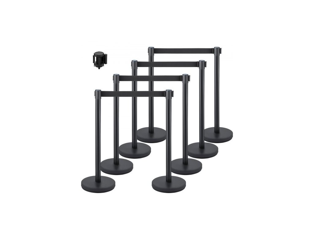 VEVOR Sloupky pro regulaci davu, sada 8 sloupků, s černým navíjecím pásem 2 m, černá bariéra pro regulaci davu s betonovou a kovovou základnou, snadná montážOcel a železo