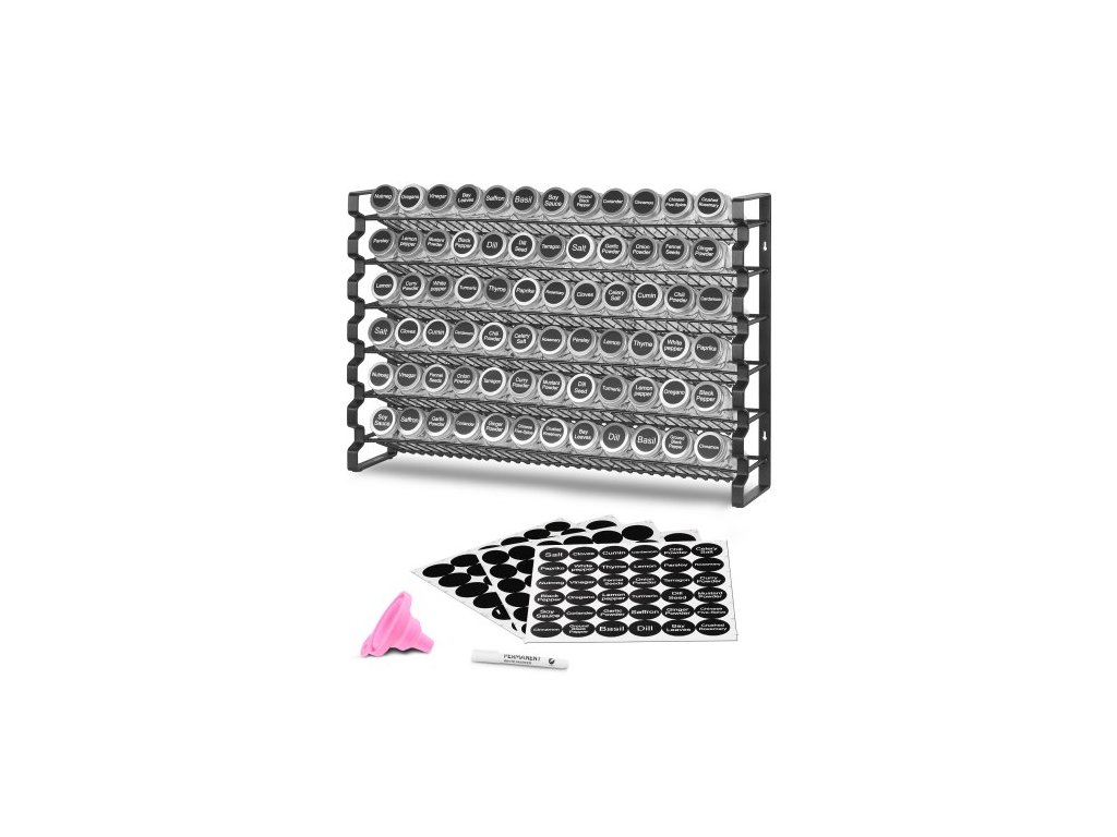 VEVOR Stojan na koření do skříňky, organizér na koření se 72 prázdnými dózami na koření, víčky, štítky na koření a kompletní sadou trychtýřů, organizér na koření na pracovní desku, do kuchyně, spíže, do skříně, 23x16 palců
