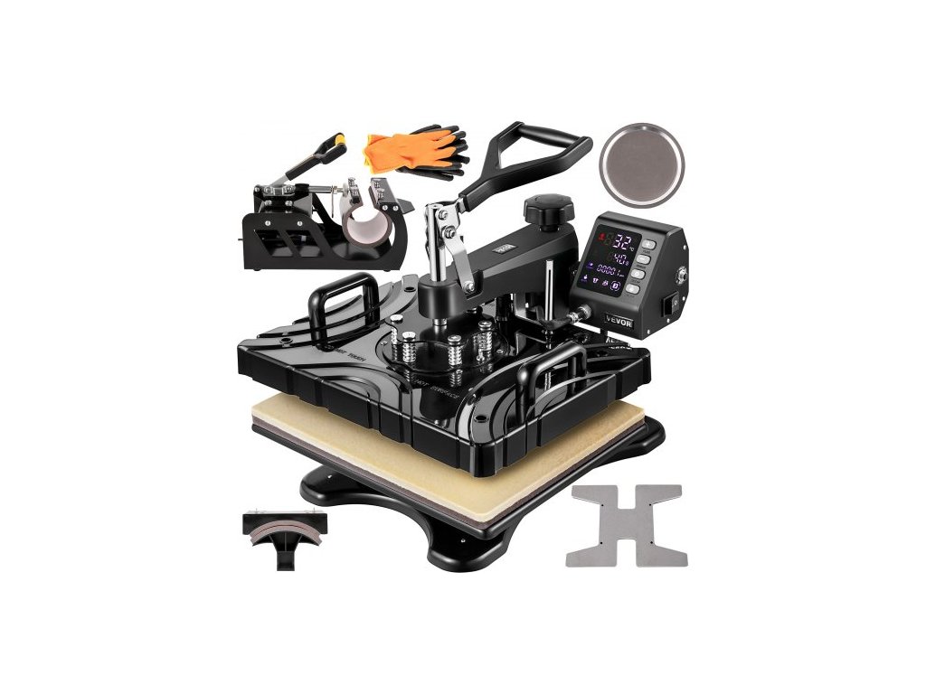 VEVOR tepelný lis 12x15 palců 6 v 1 tepelný lis 1000W výkyvný černý sublimační tiskový transferový stroj lis na trička s dvojitým ohřevem a přesným ovládáním obrazovky pro kutily, hrnky s víčky a boty