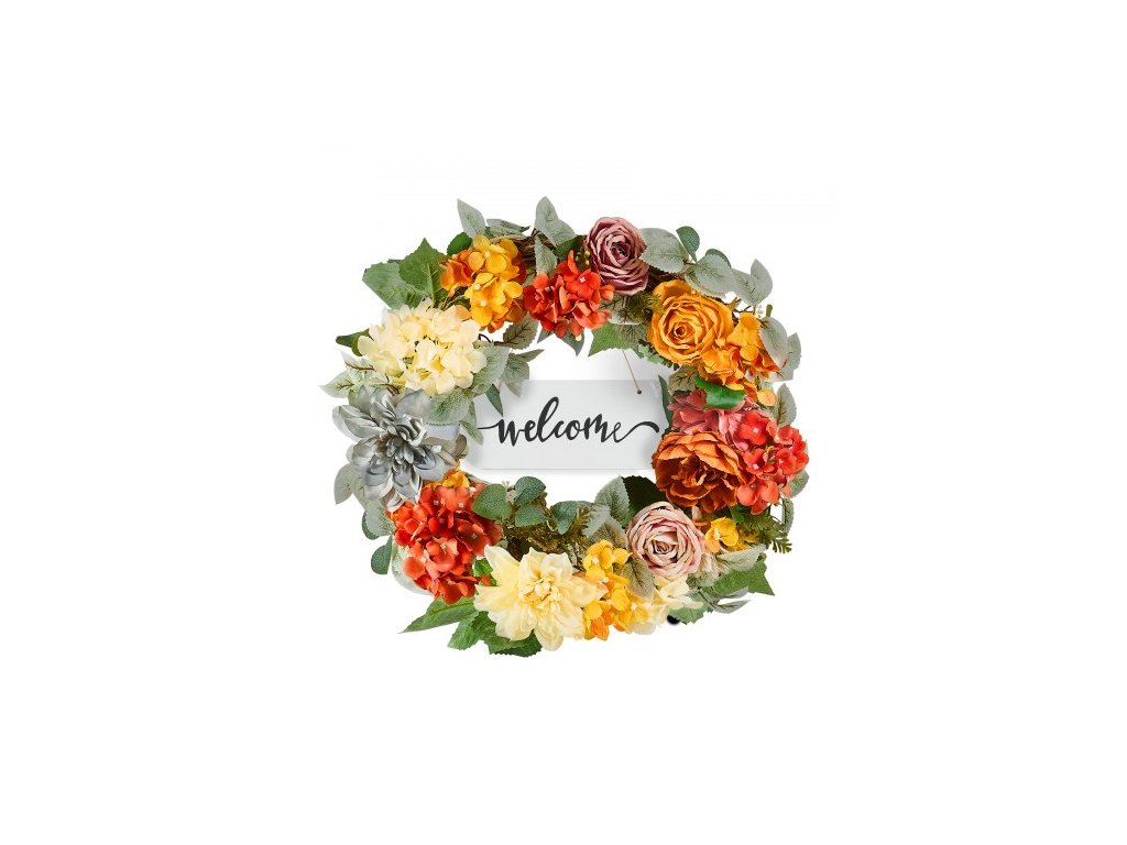 VEVOR Umělý dekorativní věnec, 24 palců, červená oranžová žlutá, zdobený hortenziemi, růžemi, dřevěná cedule, celoroční věnec pro všechna roční období, vnitřní i venkovní dekorace na stěnu, okno, festivalRealistické repliky květin v měřítku 1:1