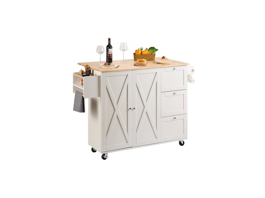 VEVOR Vozík na kuchyňský ostrov s deskou z masivního dřeva, 45,3" šířka mobilní vozíky s úložnou skříňkou, pojízdný kuchyňský stůl s věšákem na koření, věšák na ručníky, list a zásuvka, přenosné ostrůvky na kolečkách, bílá
