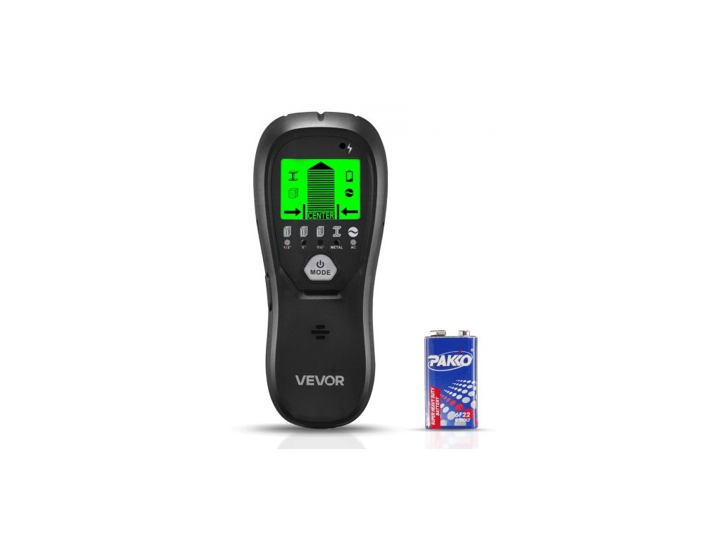 VEVOR Vyhledávač stěnových trámů, 5 v 1, elektronický detektor stěnových trámů s inteligentním senzorem, LCD displejem s vysokým rozlišením a zvukovým alarmem, pro střed a okraj kovu, AC dráty, trámy, trubky, černýVícerežimové skenování stěn