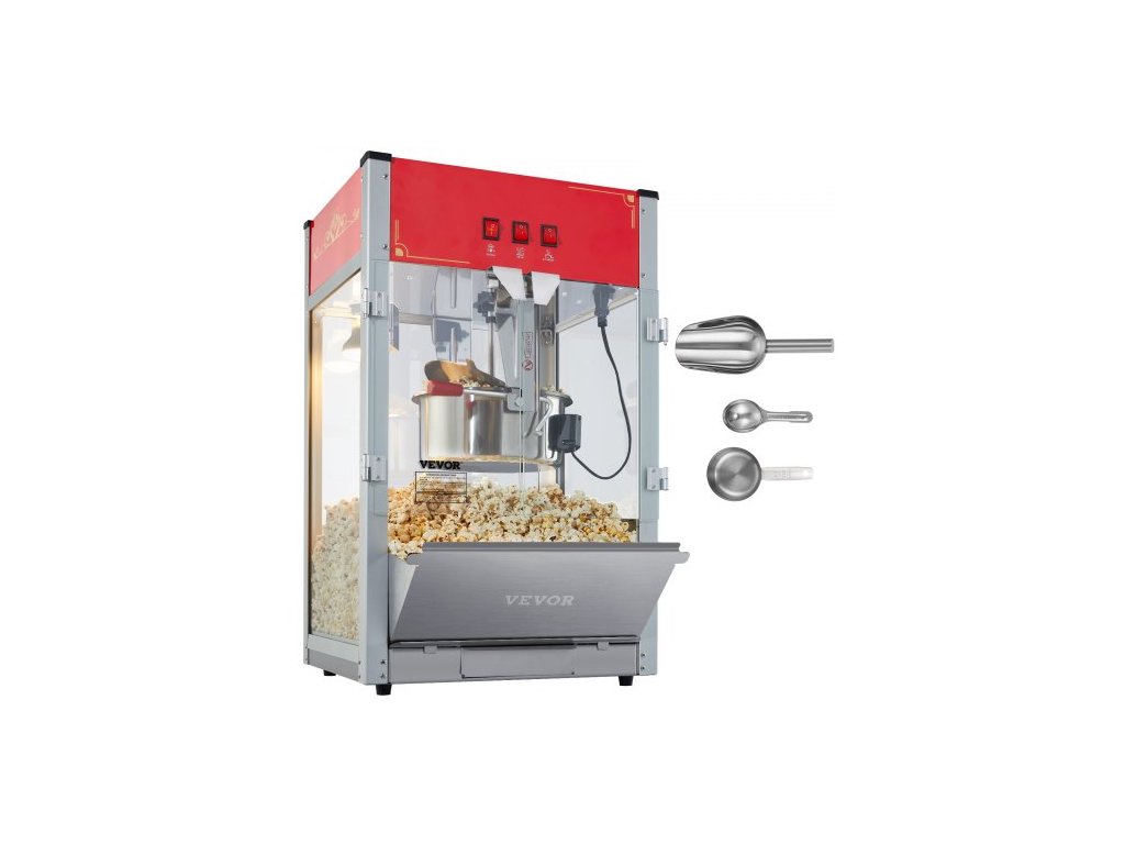 VEVOR Výrobník popcornu, 1440W stroj na popcorn, konvice o objemu 355 ml, připraví 80 šálků na dávku, stolní výrobník popcornu s tvrzeným sklem, 3 odměrky z nerezové oceli, styl kina, červenýSkvělý zážitek