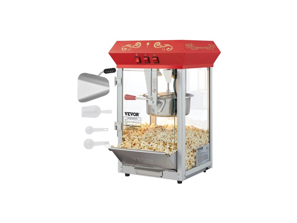 VEVOR Výrobník popcornu, 850W stroj na popcorn, konvice o objemu 240 ml, vyrobí 48 šálků na dávku, stolní výrobník popcornu s tvrzeným sklem, obsahuje 4 odměrky, styl kina, červenýSkvělý zážitek