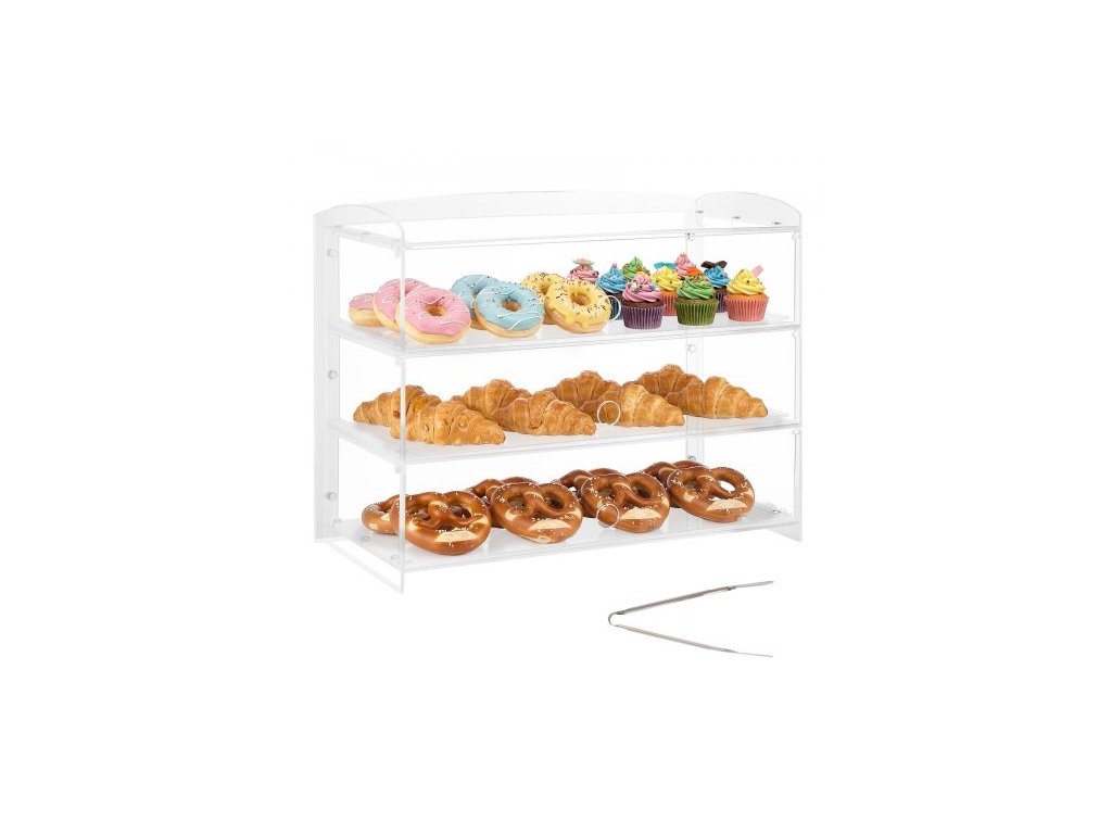 Vitrína na pečivo VEVOR, třípatrová komerční vitrína na pečivo na pracovní desku, průhledná akrylová krabička na chlebník do kuchyně, vitrína na párty dorty s výklopnými dvířky na sušenky a dezertní koblihy, 482 x 232 x 380 mmZrozeni k prezentaci dezertů