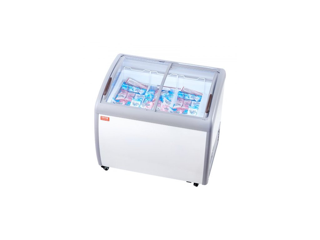 Vitrína na zmrzlinu VEVOR pro komerční účely, mrazicí truhlice o objemu 264 l, mobilní mrazák se skleněnou deskou, restaurační mrazicí vitrína na zmrzlinu se 3 drátěnými košíky, 2 posuvné skleněné dveře, kolečka s uzamykáním, bíláVelká kapacita