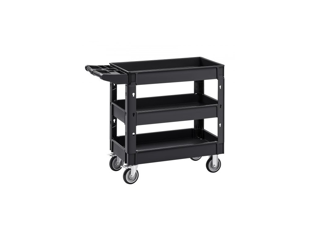 Vozík VEVOR pro údržbu užitkových vozidel, nosnost 550 liber, 3 police, robustní plastový pojízdný vozík s otočnými koly o 360° (2 s brzdami), ergonomická rukojeť pro skladování/garáž/úklidEfektivní doprava