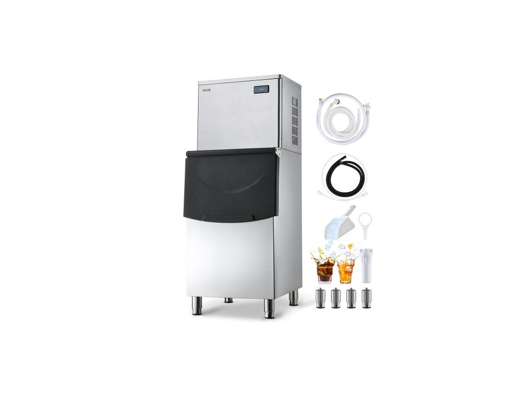 Výrobník ledu VEVOR pro komerční účely, 204 kg/24 hodin, výrobník ledu s nerezovým zásobníkem o objemu 113 kg, automatický samočisticí výrobník ledu s dotykovou obrazovkou pro bary, kavárny, restaurace, firmy a komerční účely.