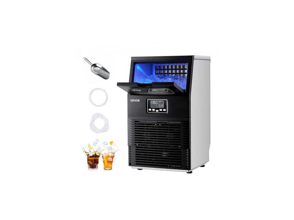 Výrobník ledu VEVOR pro komerční účely, 36,29 kg/24h s úložným prostorem 5,44 kg, 32 kostek na cyklus, volně stojící a stolní výrobník ledu z nerezové oceli s LED displejem a samočištěním, pro domácí bary a restauracePosuvné dveře
