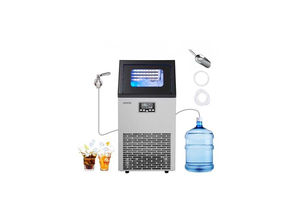 Výrobník ledu VEVOR pro komerční účely, 54,43 kg/24h s úložným prostorem 12,7 kg, 45 kostek na cyklus, volně stojící a podpultový výrobník ledu z nerezové oceli s LED displejem a samočisticím systémem, pro bary a restauracePosuvné dveře