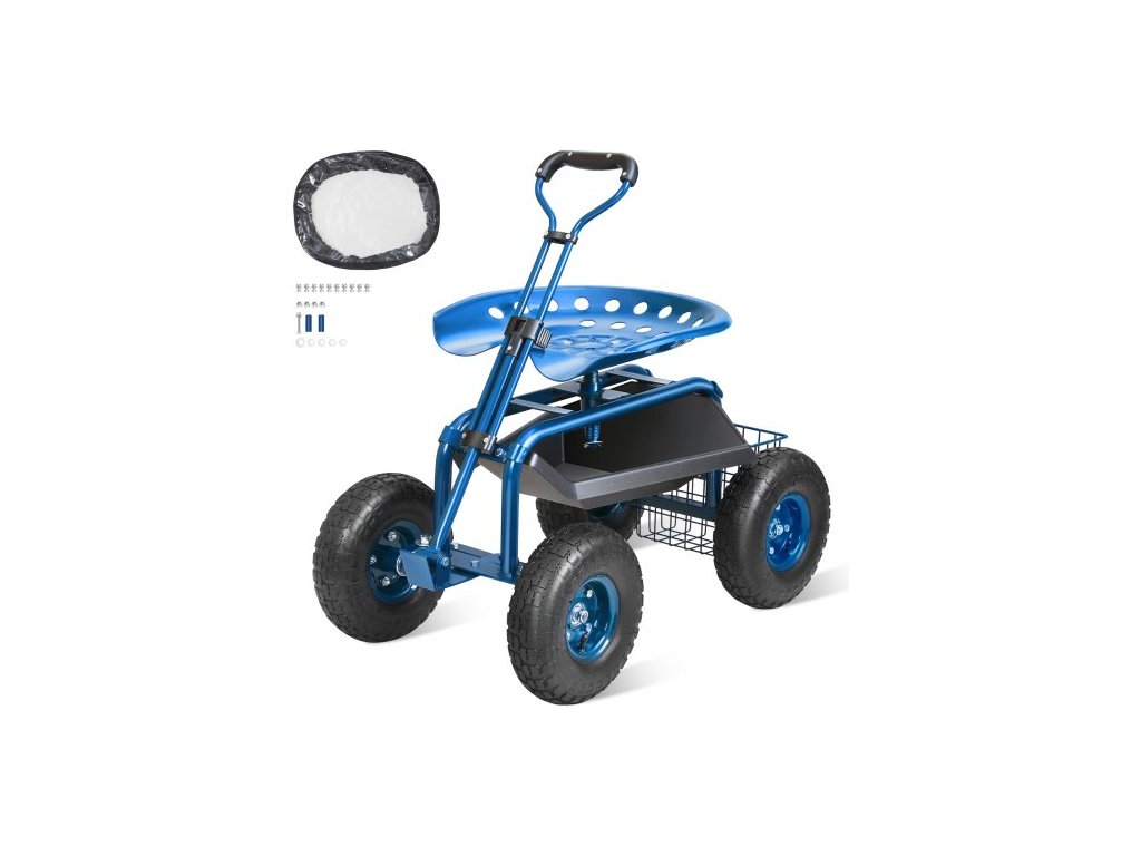 Zahradní vozík VEVOR, pracovní stolička s kolečky, zahradní stolička pro sázení, otočné sedadlo o 360 stupňů, koloběžka s řídítky a odkládací miskou na nářadí, použití na terasu, dvůr a venku, modráOtočné sedadlo pro všestranné použití