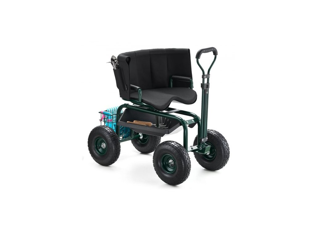 Zahradní židle VEVOR s kolečky, kolečková zahradní stolička s výškově nastavitelným a 360° otočným sedákem, nosnost 181 kg, zahradní lavice, ergonomické opěradlo a úložný prostor pro nářadí, pro zahradu, dvůr, terasuOdnímatelný měkký polštář