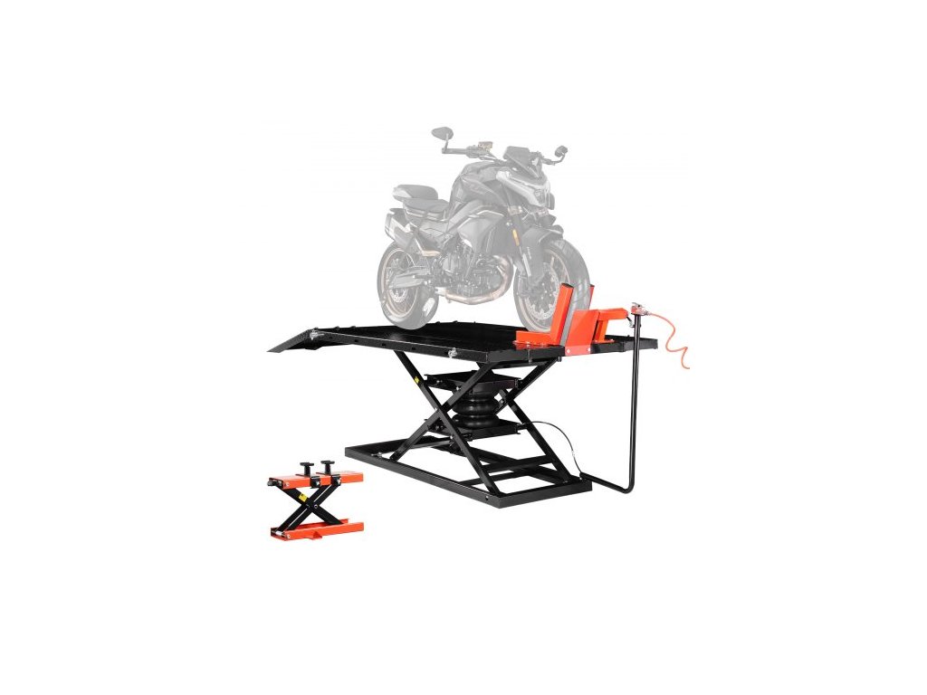 Zvedací stůl pro motocykly VEVOR, nosnost 726 kg, pneumatický zvedák pro motocykly, výškový rozsah 21,6–76 cm, stojan pro opravy těžkých motocyklů s odnímatelným pracovním stolem, opravárenský stojan pro čtyřkolky, terénní motocyklyX závorka